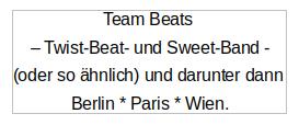 Übrig von den ursprünglichen Team Beats waren nun noch – außer Butschi – Olaf und Atze. Was da mit der Stelle des Bassisten los war, habe ich irgendwie vergessen.